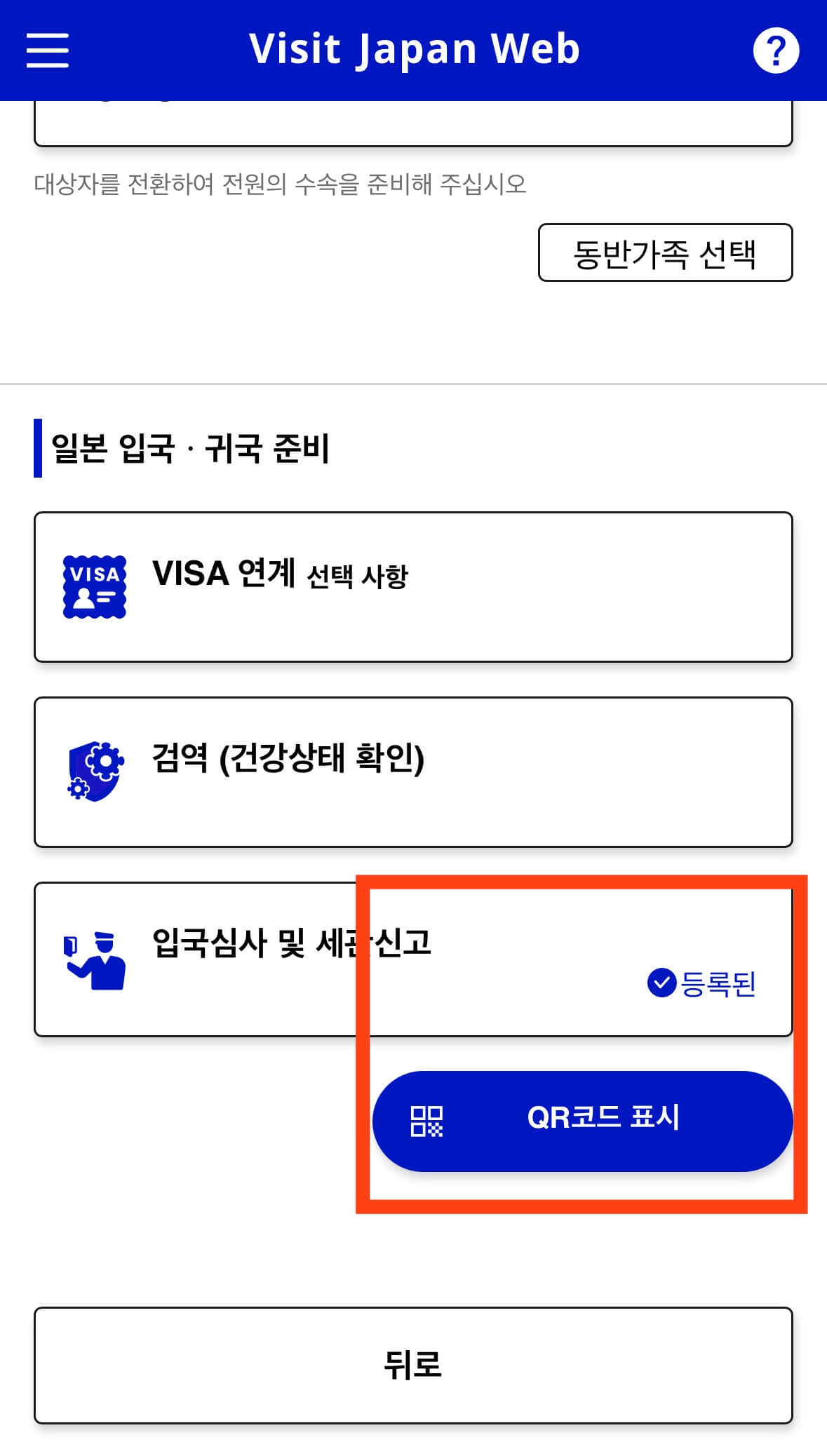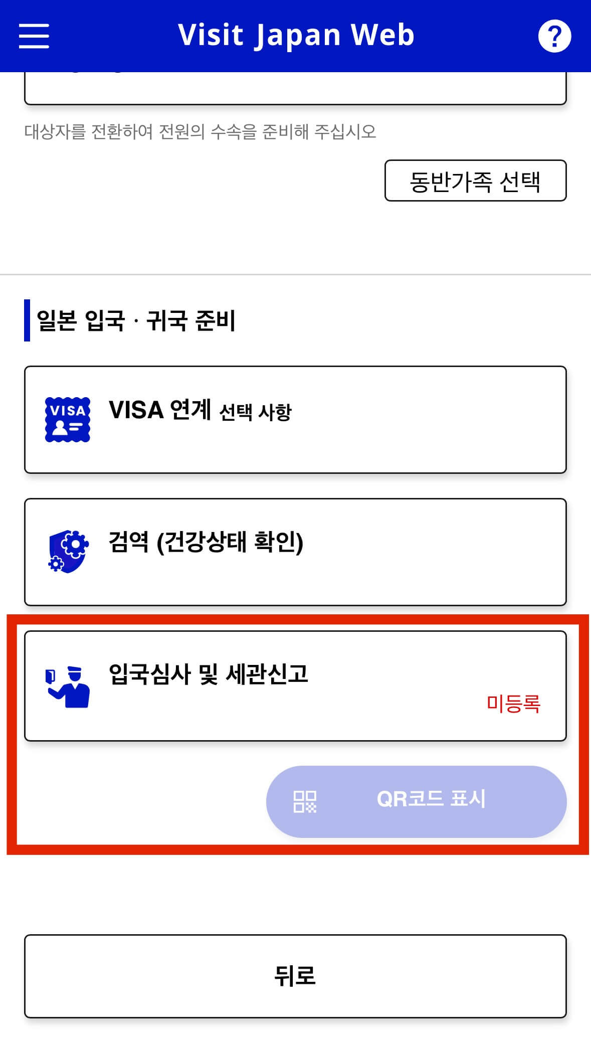 위의 입국·귀국 예정 등록 완료하였다면 입국심사 및 세관신고까지 작성해야 QR코드가 생성됩니다.