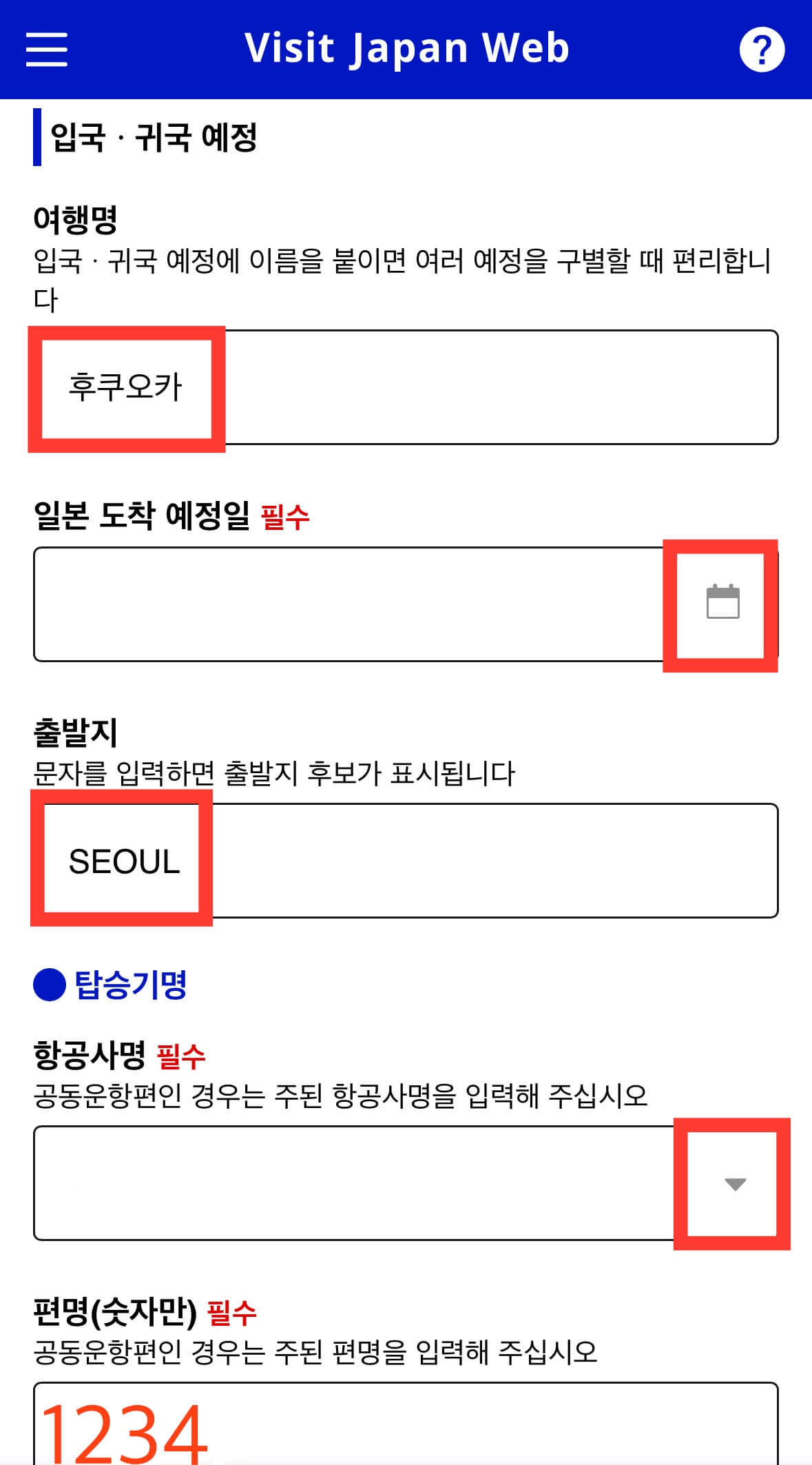 - 여행명, 일본 도착 예정일, 출발지, 항공사명, 편명을 순서대로 기입합니다.
