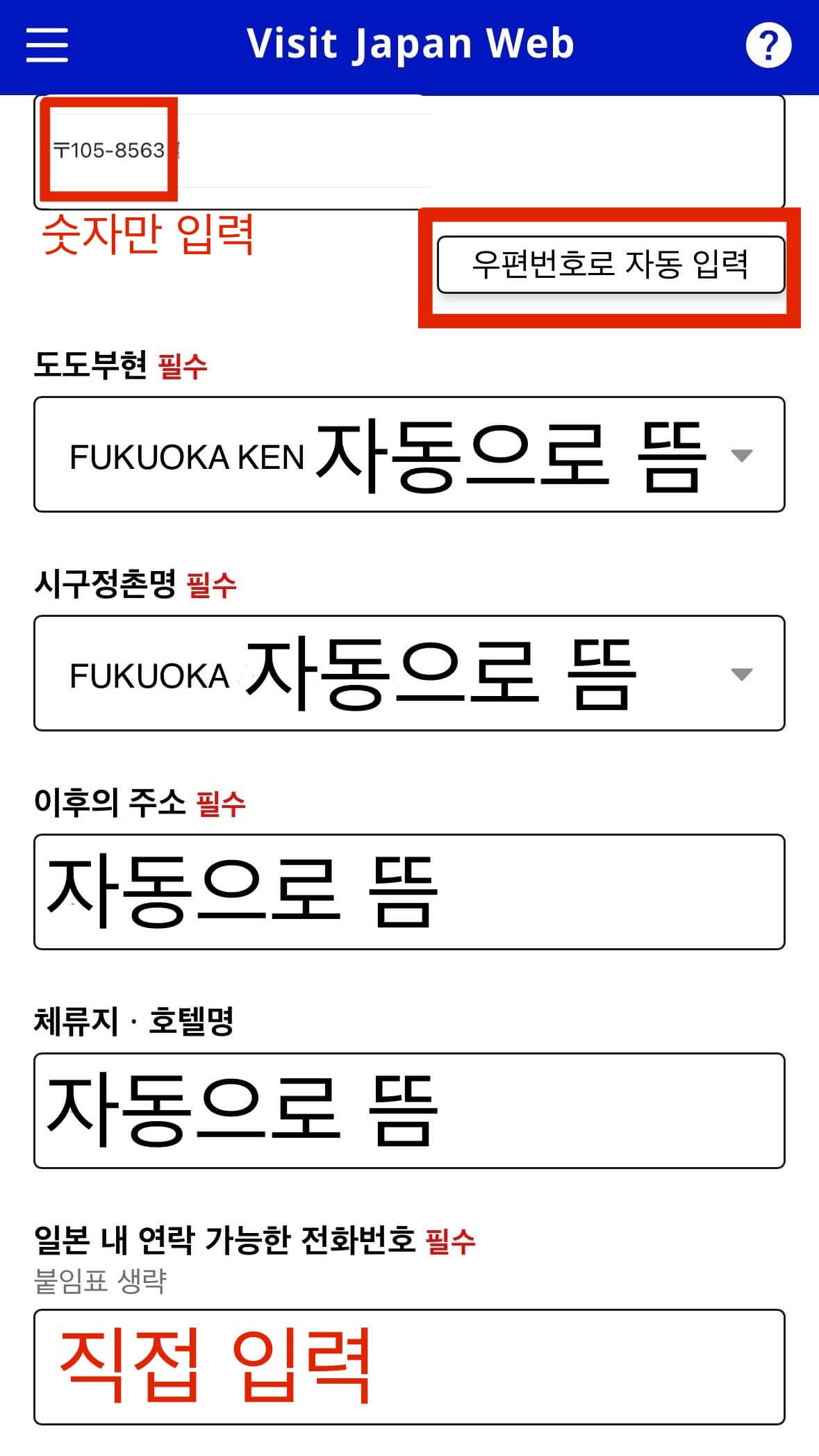 *일본 내에서의 통신 상황과 입국 시 여행객들로 인해 번잡할 것으로, 한국에서 미리 작성하여 캡처해 놓는 것을 추천합니다.